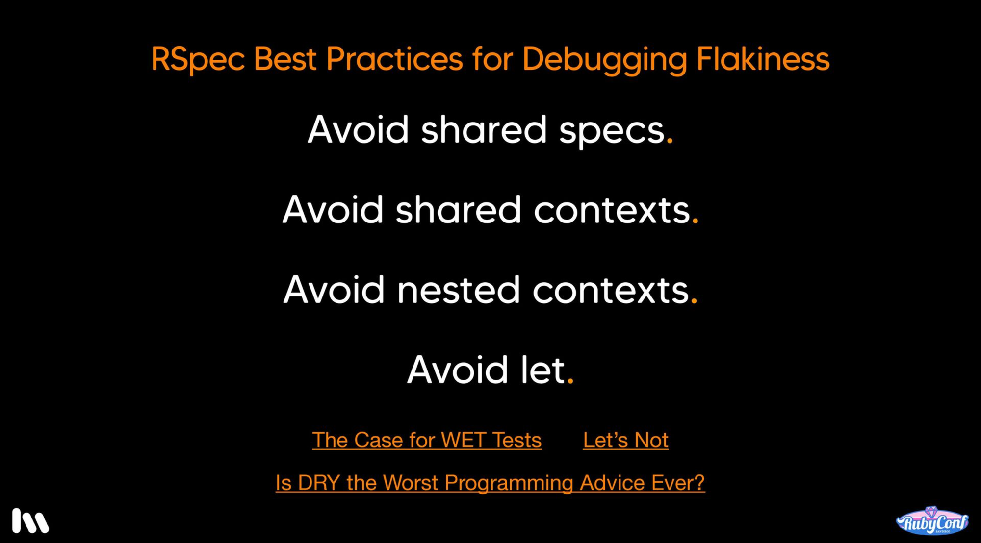 I want to thank everyone who attended (whether you came to my talk or not) for making the conference such a wonderful, supportive, friendly environment. The Ruby community is known for this. But, this conference felt even more special.