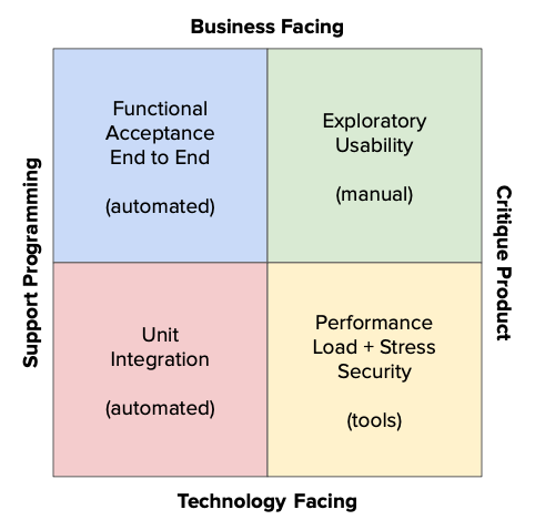 For more information, check out Brian Marick’s original Agile Testing posts, or Google Agile Test Quadrants.